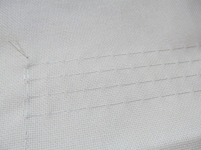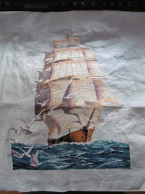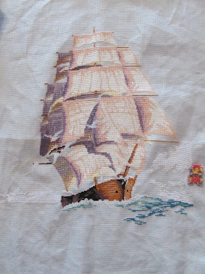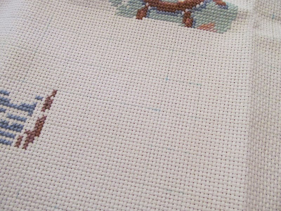 7. Morski sampler. Ufok. Śmieć :( Zrobiłam trochę i odłożyłam. I zapomniałam o jego istnieniu... Niestety kratki zrobiłam mazakiem spieranym wodą. Mazak jak widać zniknął sam z siebie, ale zostawił ślady. Niestety, one średnio chcą zejść z materiału, a tło nie jest całe zakryte :/ Tak więc zacznę to od początku na innej tkaninie i mulinami DMC które mi nie puszczą barwnika na koniec pracy tak jak muliny używane przez DIMENSIONS w starych zestawach...