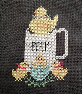 Moje kurczaczki haftowałam na Lindzie 27 ct, dlatego widać dosyć duże prześwity czarnej tkaniny pod kubeczkiem, ale w sumie podoba mi się ten efekt :) Hafcik szybki, bo tylko 1103 krzyżyki, ale powstawał równo tydzień. Mam pomysł na wykończenie hafciku, ale potrzebuję w tym celu udać się do Ikei, albo innego większego sklepu wykończeniowego, co pewnie nie nastąpi za szybko...